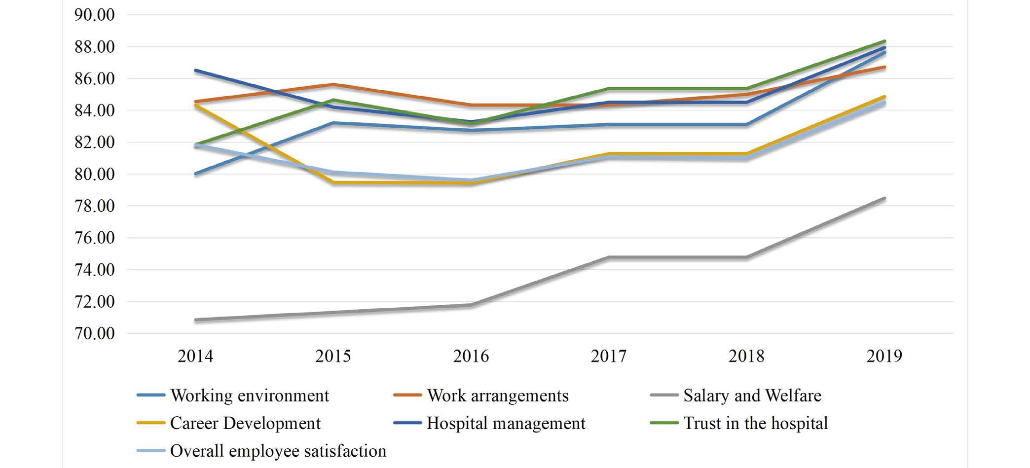The survey of hospital staff consisted of six parts: working environment, work arrangements, salary and welfare, career development, hospital management and trust in the hospital (Table 3C). The salary and welfare scores are significantly lower than other indicators. All the indicator’s scores were low in 2016 and steadily increased after 2017. Of the indicators, work arrangements, trust in the hospital, hospital management and working environment are above the average score. Career development decreased significantly in 2015 (Figure 1).