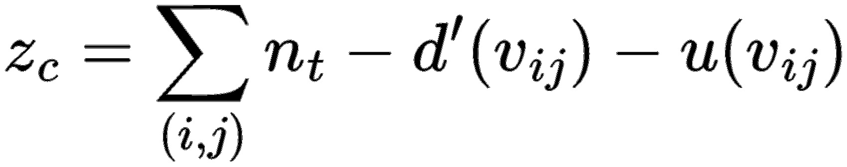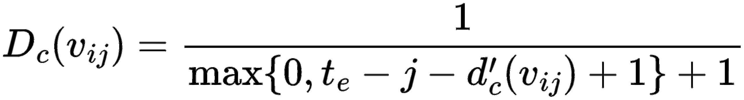 To illustrate, consider the deferment factor. On its surface, it seems distinct from edge-focused metrics because it is one of the few that incorporate timing. However, if we restrict the delay factor to only consider prerequisite relationships, which we'll denote by dc'(vij), we can find a closed-form expression for Dc(vij) in terms of dc'(vij). Because the value of k determines the deferment factor, the number of terms a student can fail a course before extending their time to degree, we need to calculate the number of terms the student has available to them past the term the course is offered (i.e., te − j). Then, we need to know how embedded the course is in the prerequisite structure - or more specifically, how long the prerequisite chain is that the course belongs to - the delay factor, ignoring corequisites, dc'(vij). Then, k = te − j − dc'(vij) + 1. However, we need to account for the possibility that k can be negative when the course is later in the curriculum and the delay factor is high, so we should default k to 0 in such cases. That would mean k = max{0, te − j − dc'(vij) + 1}. Substituting this value into the deferment factor equation yields the deferment factor in terms of our modified delay factor: