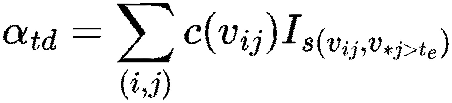 Here, c(vij) is the cruciality of the course, and Is(vij, v*j > te) is the indicator function identifying courses that are connected to courses that extend the student's time to degree, te. For example, consider a transfer student entering a program structured as shown in Figure 2, with an expected graduation time of 3 semesters (i.e., te = 3). By design, the student cannot complete the program because course I is extending completion beyond the expected two-term mark. If we assign cruciality scores, we find that c(B) = 11, c(D) = 7, c(G) = 5, and c(I) = 4. So, αtd= 11 + 7 + 5 + 4 = 27.