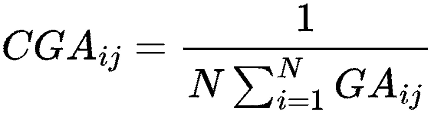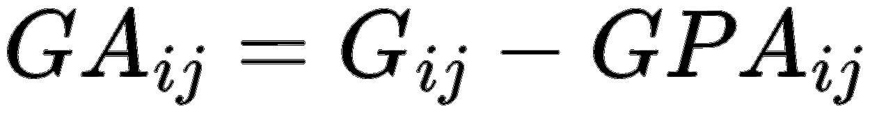 Here, GAij is the grade anomaly of student i in course j, which is the difference between the student's grade from the focal course, Gij, and their overall GPA, GPAij. Note that grade anomaly is at the individual student level. At the course level, course grade anomaly (CGA) is the mean discrepancy between the students' GPAs and their grades for a given course: