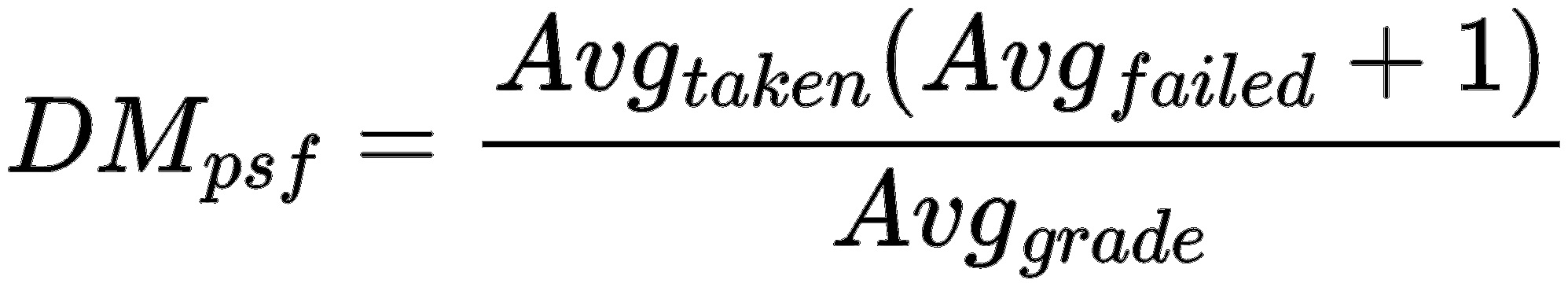 The DMpsf factor in the equation is a "difficulty metric consider[ing] the average number of times a student had taken the exam (Avg_taken), the average number of times a student had failed (Avg_failed), and the average grade of the exam (Avg_grade)" (Basavaraj, 2020, p. 38). In this case, "exam" refers to program-specific exams outside the context of specific courses.