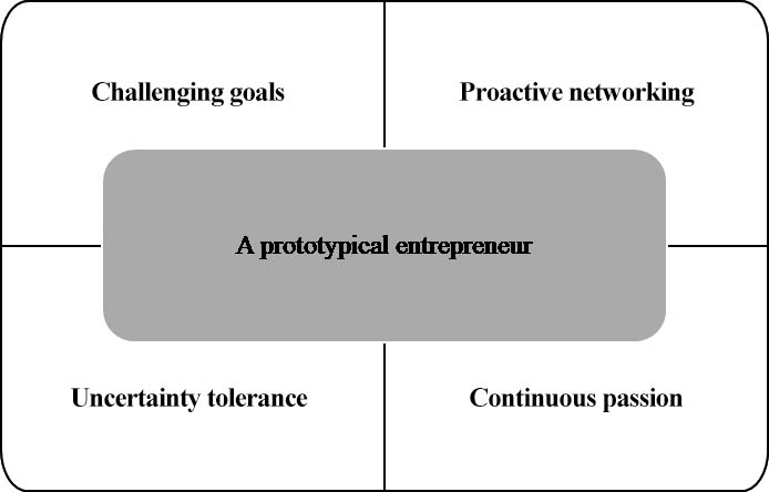 Our emphasis on entrepreneurship prototypes is consistent with trait research in entrepreneurship. Embracing the most common phenomena in the literature, it covers the following fundamental dimensions: Challenging goals, proactive networking, uncertainty tolerance, and continuous passion (Figure 1). These qualities have been consistently associated with the pursuit of opportunity. Schema approaches suggest that individuals describe themselves as possessing specific characteristics, structure their beliefs and experiences in terms of these characteristics, and generally tend to behave in ways suggested by these characteristics.[27] The following paragraphs unpack the theoretical exploration of these qualities.